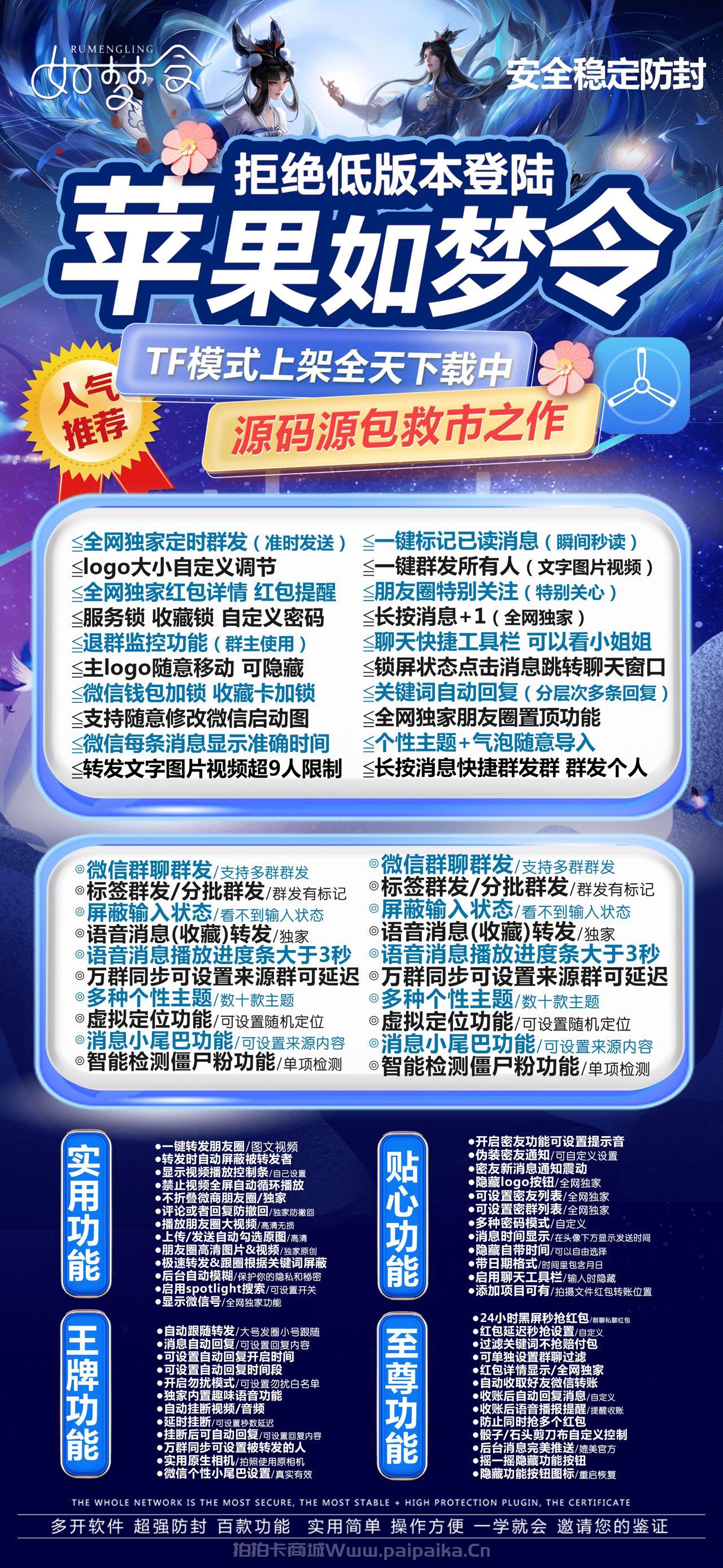 在当今这个数字化飞速发展的时代,智能手机已经成为我们生活中不可或缺的一部分。而微信,作为社交软件的佼佼者,更是几乎每个人都必备的应用程序。然而,对于许多苹果用户来说,微信多开一直是一个令人头疼的问题。幸运的是,现在我们有了一款全新的解决方案——苹果TF如梦令。超强防封,稳定可靠苹果TF如梦令作为一款微信多开软件,最大的特点之一就是其超强的防封能力。在市面上众多的微信多开工具中,很多都因为被封禁而导致用户无 ** 常使用。而苹果TF如梦令...